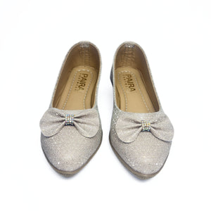 Girls Party Wear Bellies for Kids | Glitter Finish with Bow Detail | Comfortable Flat Sole | Easy Slip-On Fit | Champagne Silver | Size 2 UK