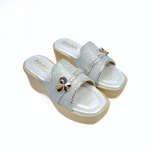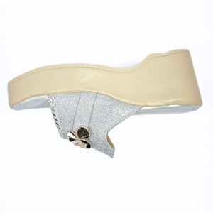 - Glittery silver upper with elegant flower detail—perfect for parties and festive occasions.