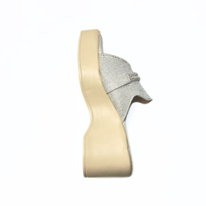 - Glittery silver upper with elegant flower detail—perfect for parties and festive occasions.